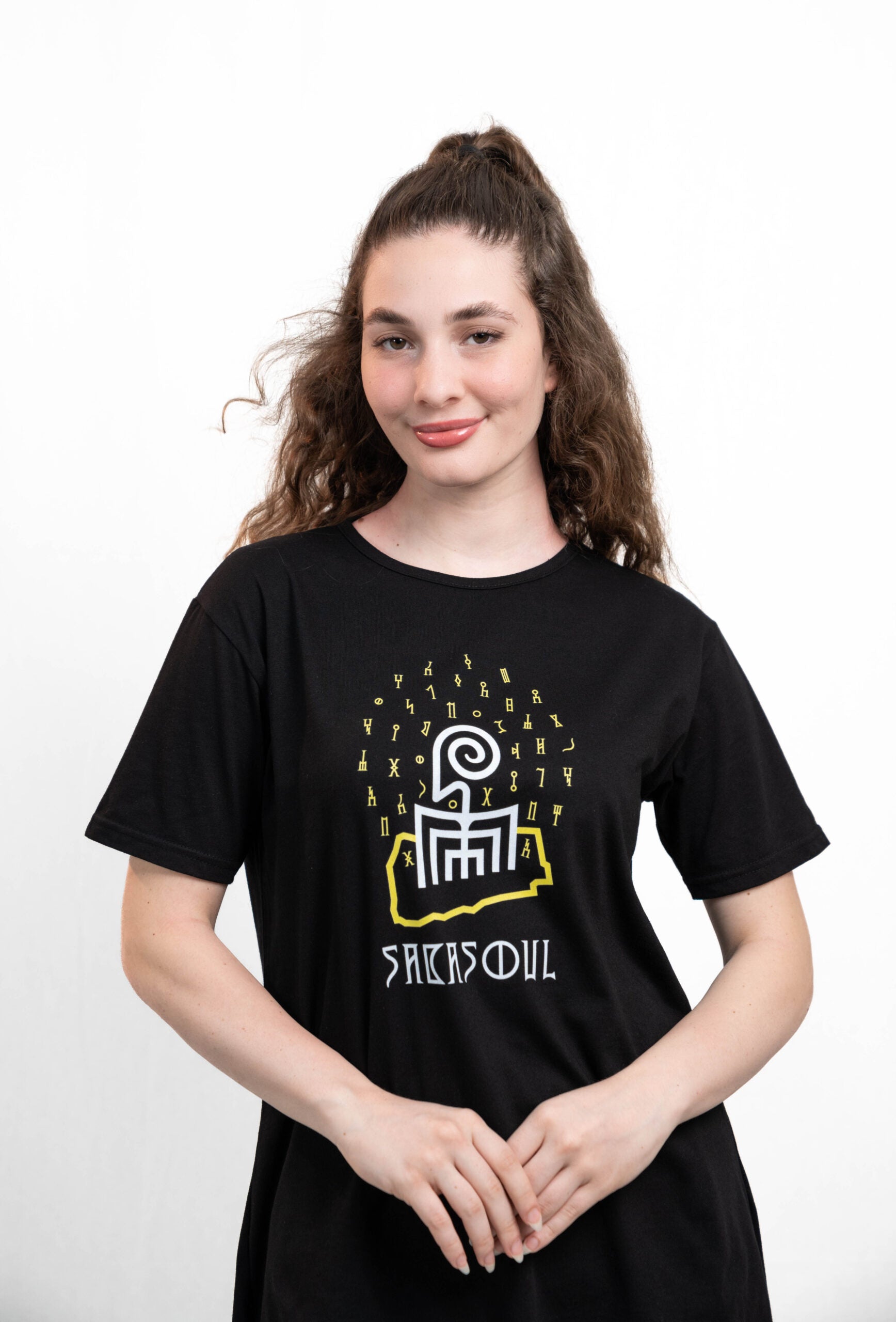 A black T-shirt featuring the iconic SabaSoul emblem outlined over a map silhouette of Yemen. Above, ancient Sabaean letters cascade like a constellation, symbolizing heritage and identity. A powerful design that connects tradition with modern fashion.