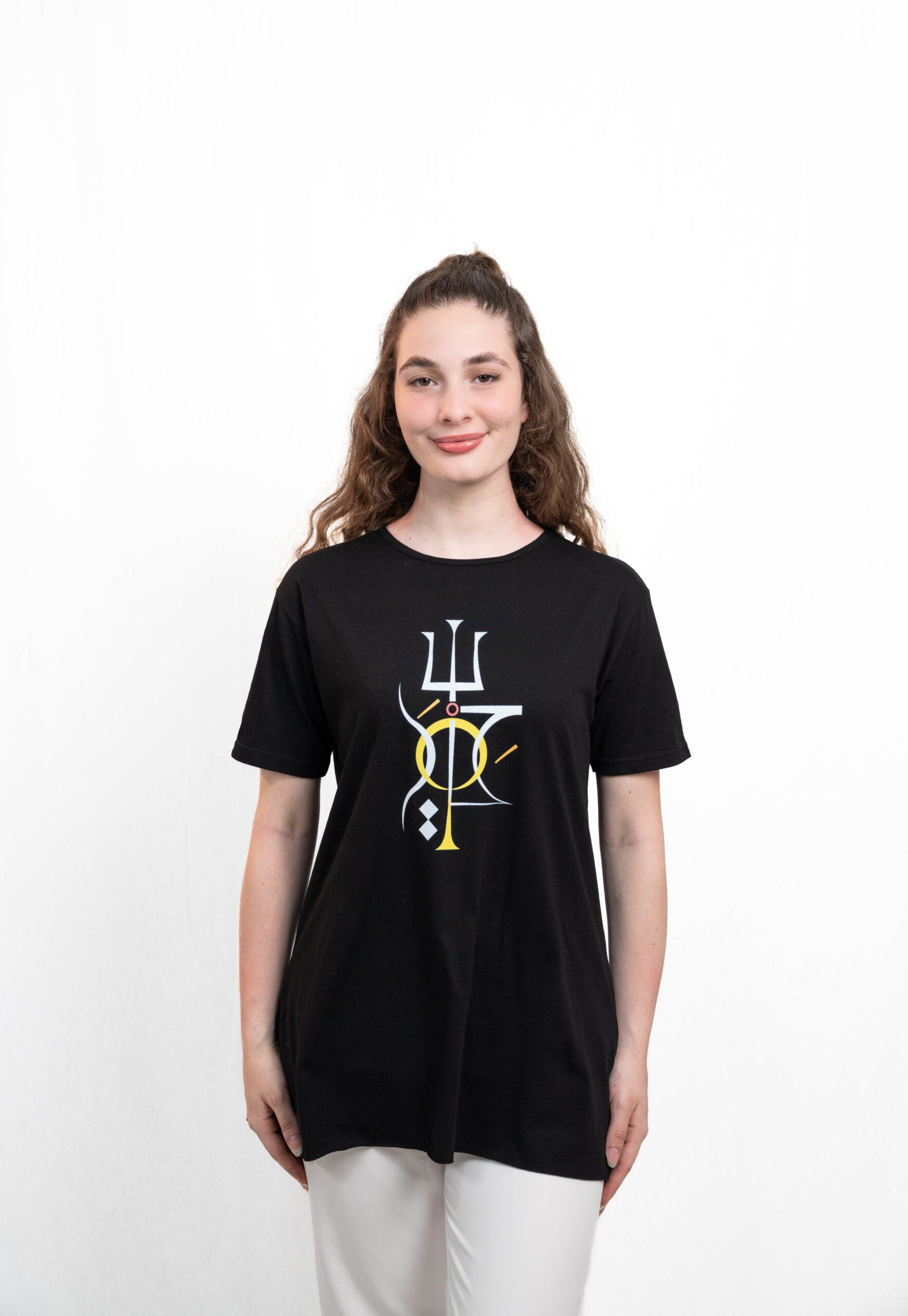 A black T-shirt featuring a bold abstract design inspired by Sabaean symbolism. The composition blends geometric precision with flowing curves, highlighted in gold, white, and red, creating a statement piece that bridges heritage with contemporary minimalism.