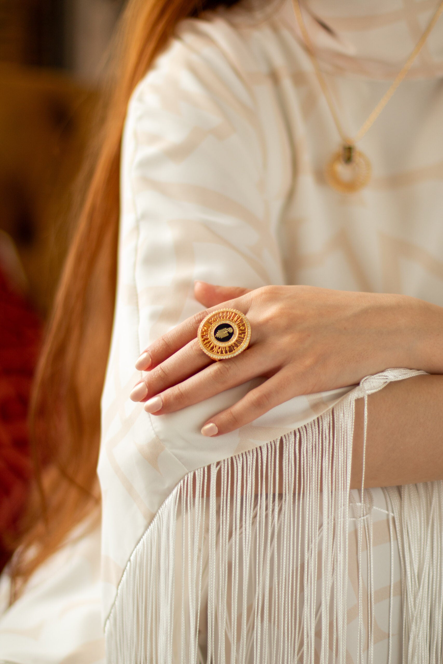 A striking circular ring adorned with the complete Sabaean Musnad alphabet along its edge, crowned at the center with the Spirit of Saba emblem. The outer rim is studded with shimmering crystals, creating a luxurious design that fuses heritage with modern elegance.