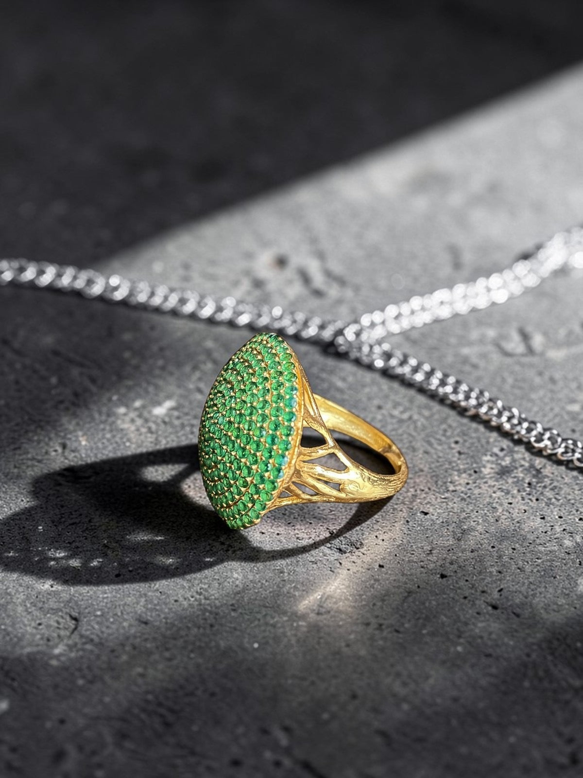A bold statement ring inspired by the columns of the Awwam Temple and crowned with the elegance of the moon, a cherished symbol in Sabaean culture. Crafted with a marble-like stone detail, this ring fuses heritage and modern luxury — perfect for a refined,...