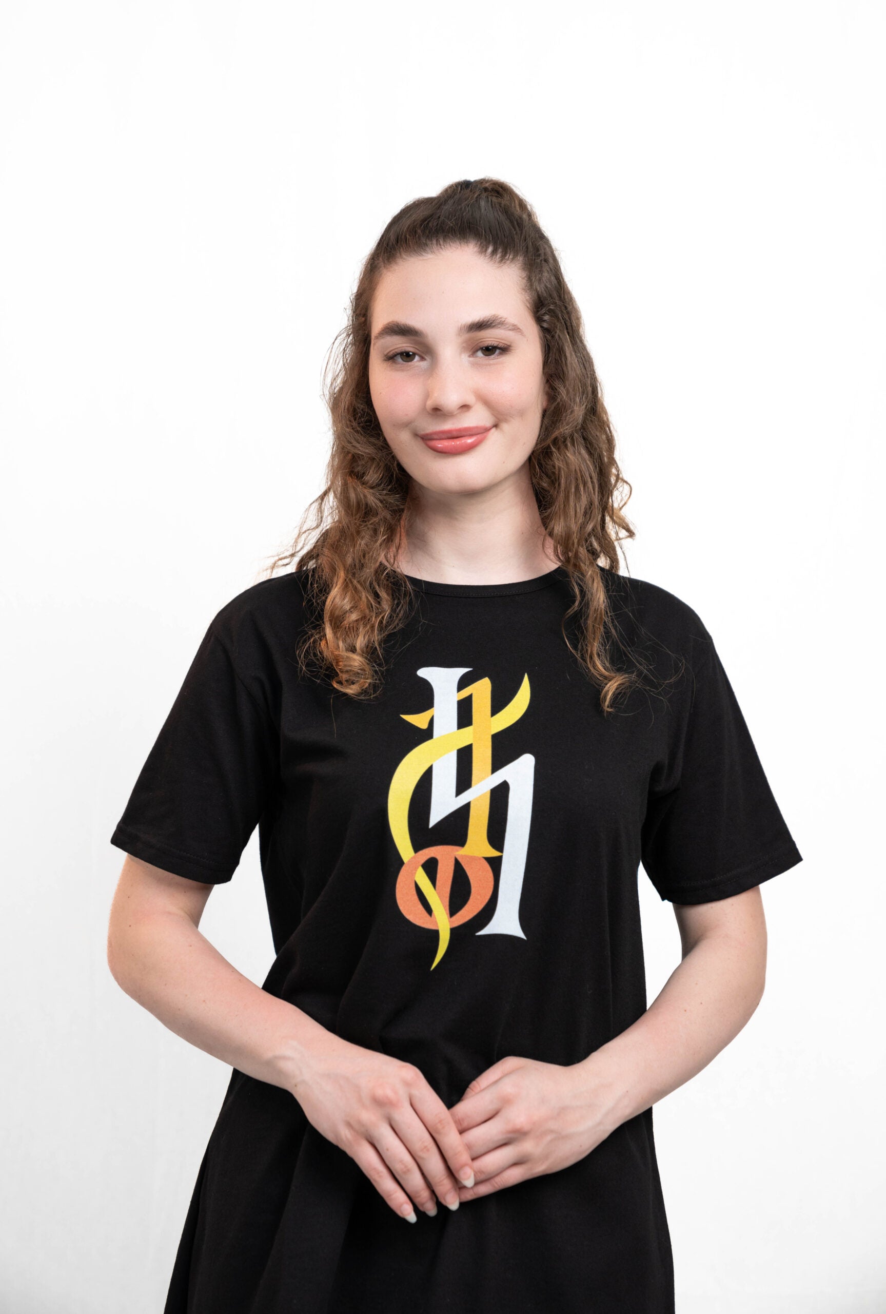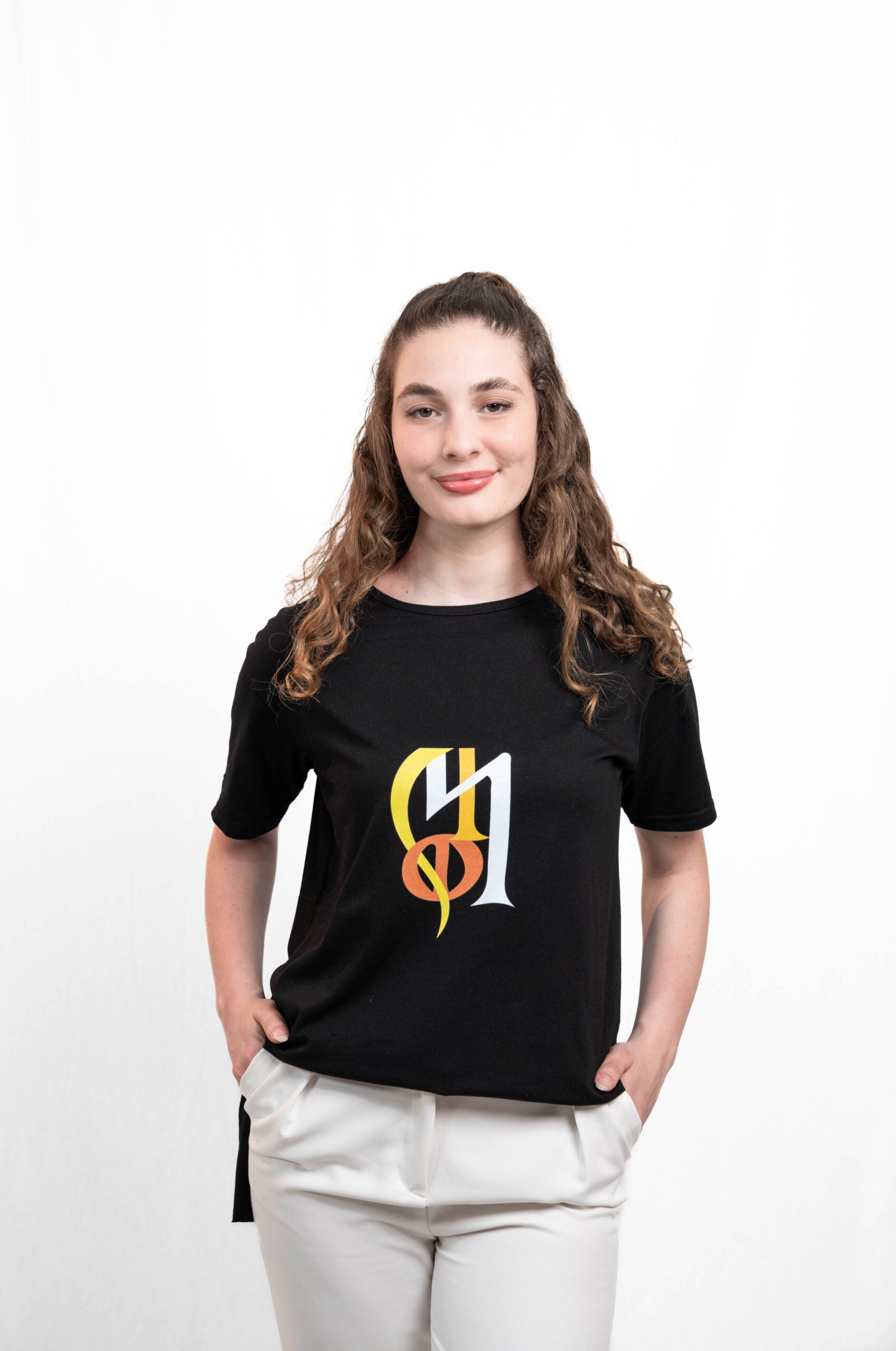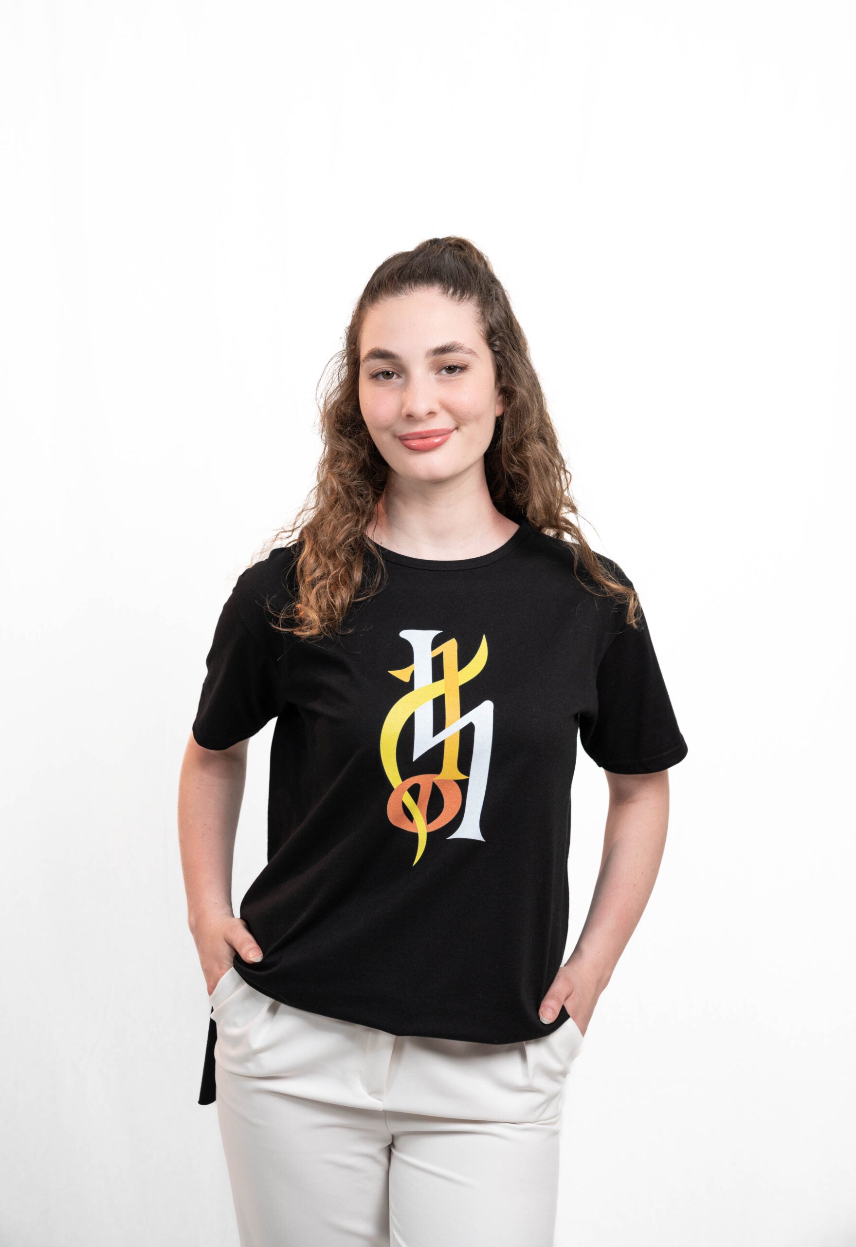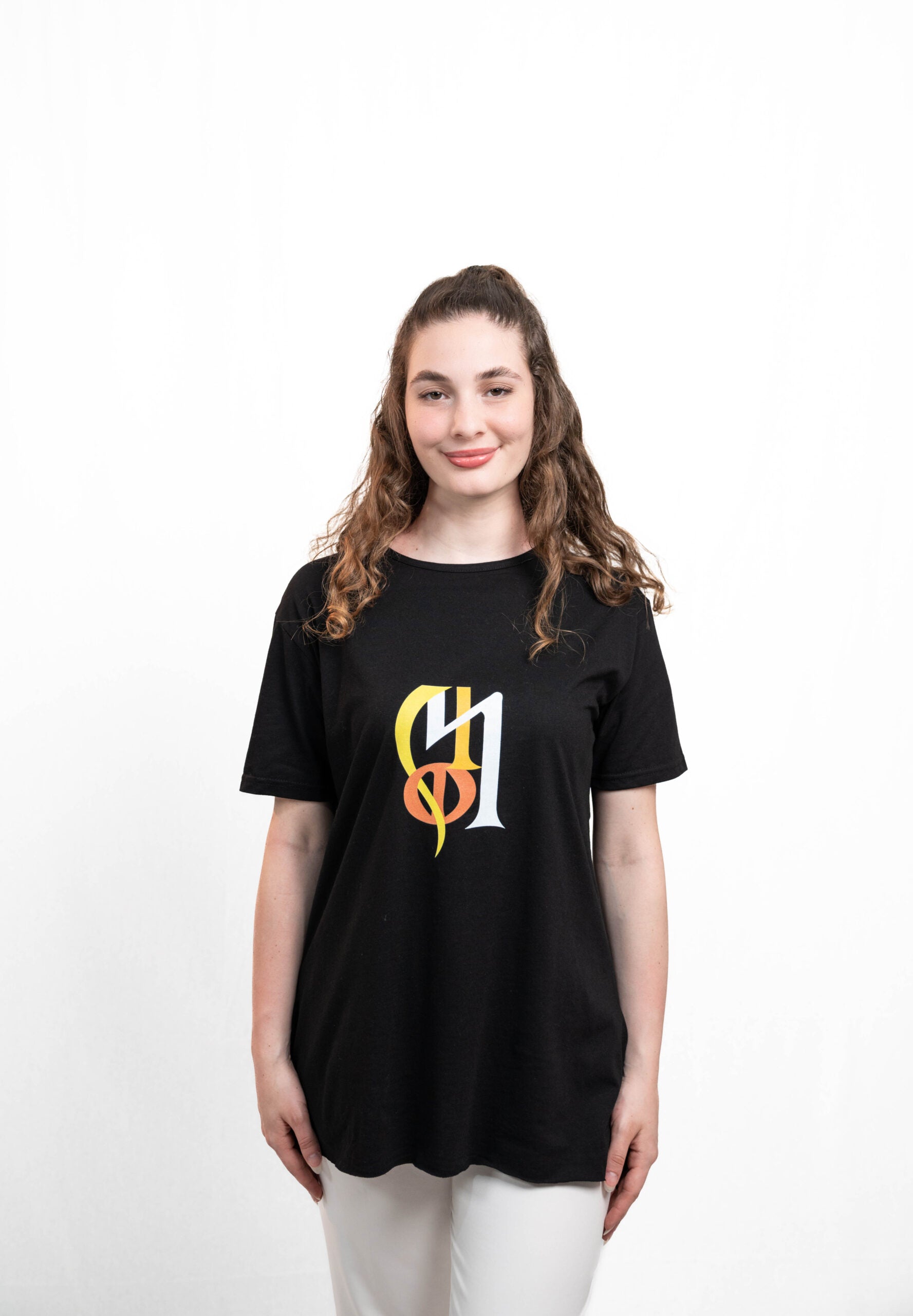 A stylish black T-shirt featuring a modern design inspired by ancient Musnad script. The bold gradient of orange, yellow, and white creates a striking contrast, blending cultural heritage with a contemporary fashion touch. Made with soft, breathable fabric for everyday comfort and style.